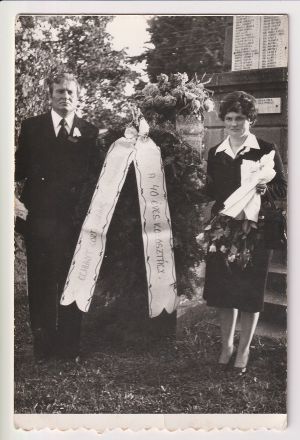 Az 1942-ben született kortársak 40 éves találkozója alkalmával készült kép az alfalvi templom cintermében. Az elhunyt kortársak emlékére készített koszorút tartó nő, Fejér Antalné. Háttérben a világháború hőseinek emlékműve.